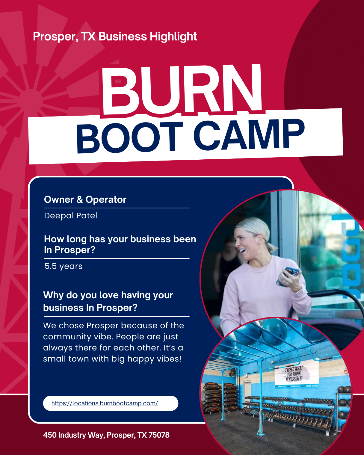 Over the years, Burn Boot Camp has cultivated a tight-knit, uplifting environment that perfectly reflects Prosper’s spirit. “The people,” Deepal said when asked what she loves most about doing business in Prosper. “This community is amazing—always there for each other, no matter what.”
